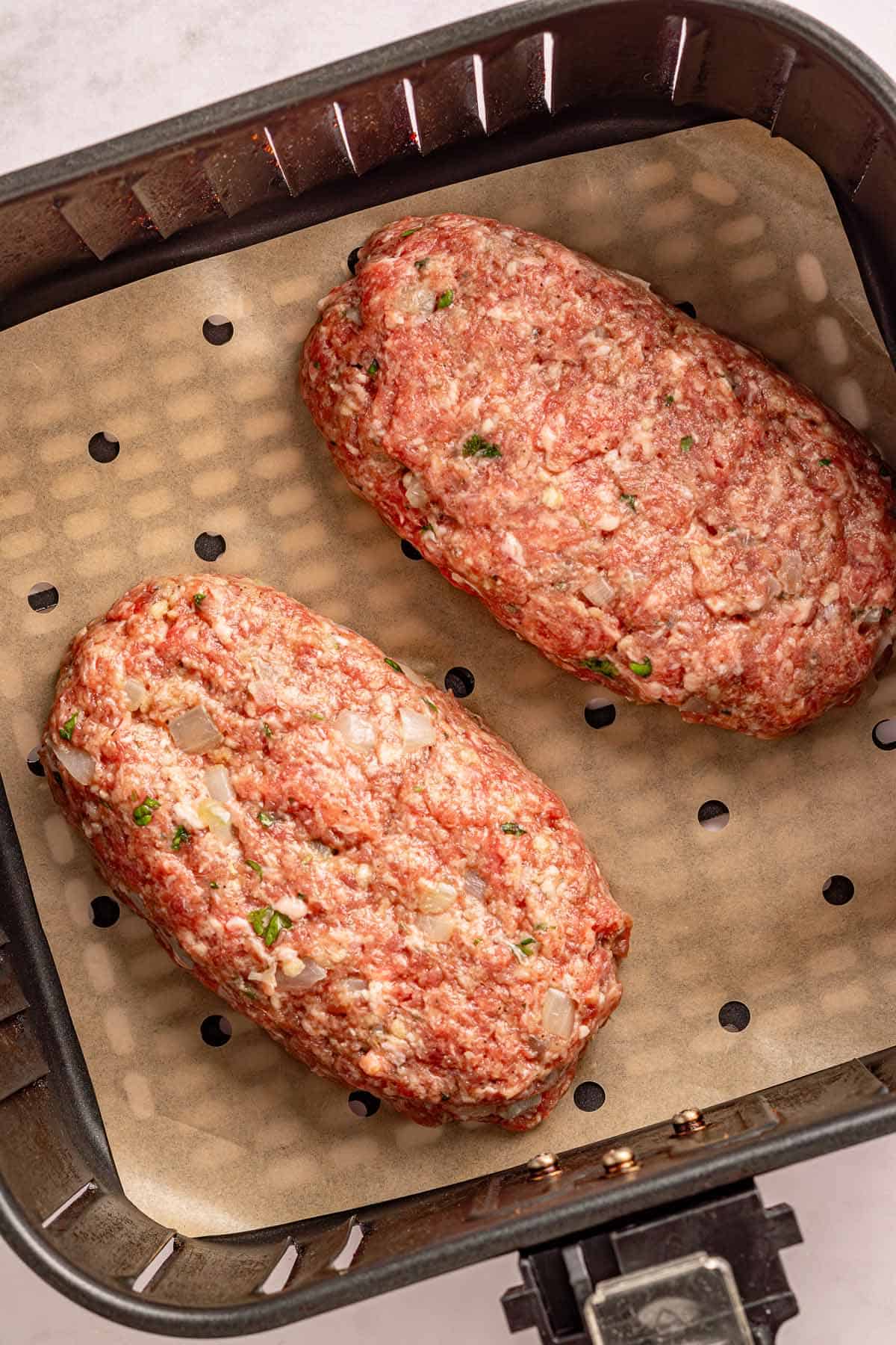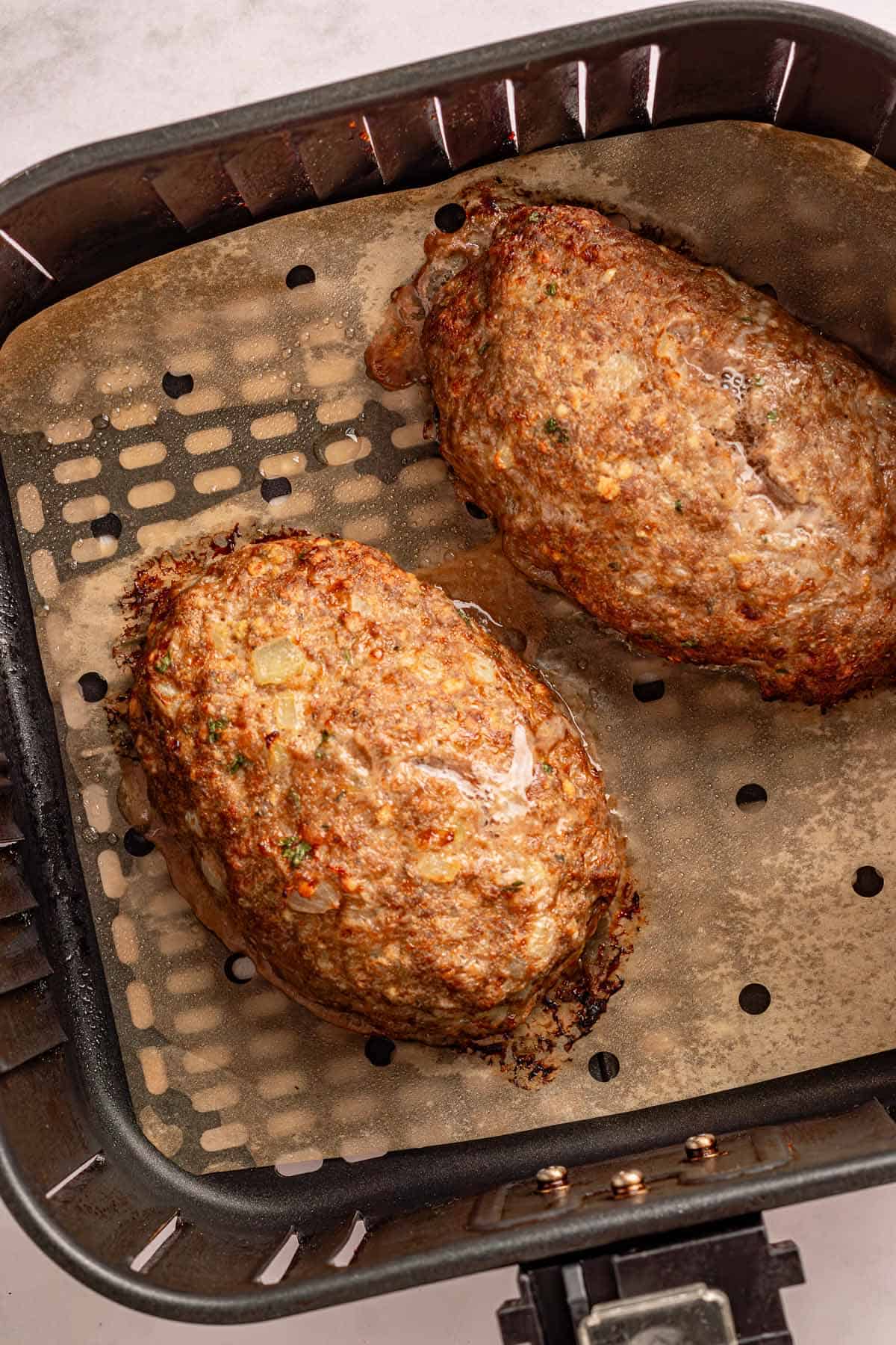 - Add ground beef and cooked onion mix gently until combined. Divide into 2 loaves and shape smoothing edges. Cook in air fryer for 15 minutes.1 pounds lean ground beef