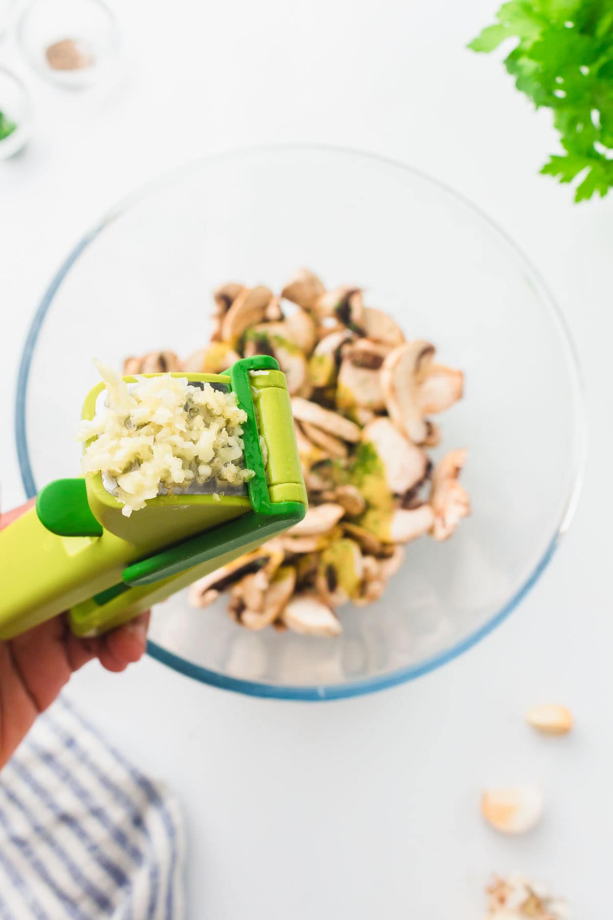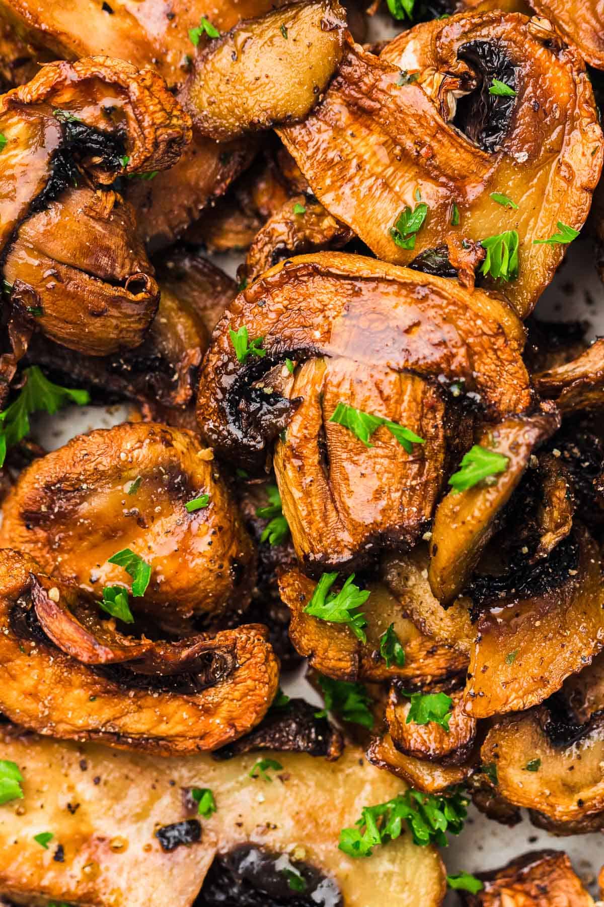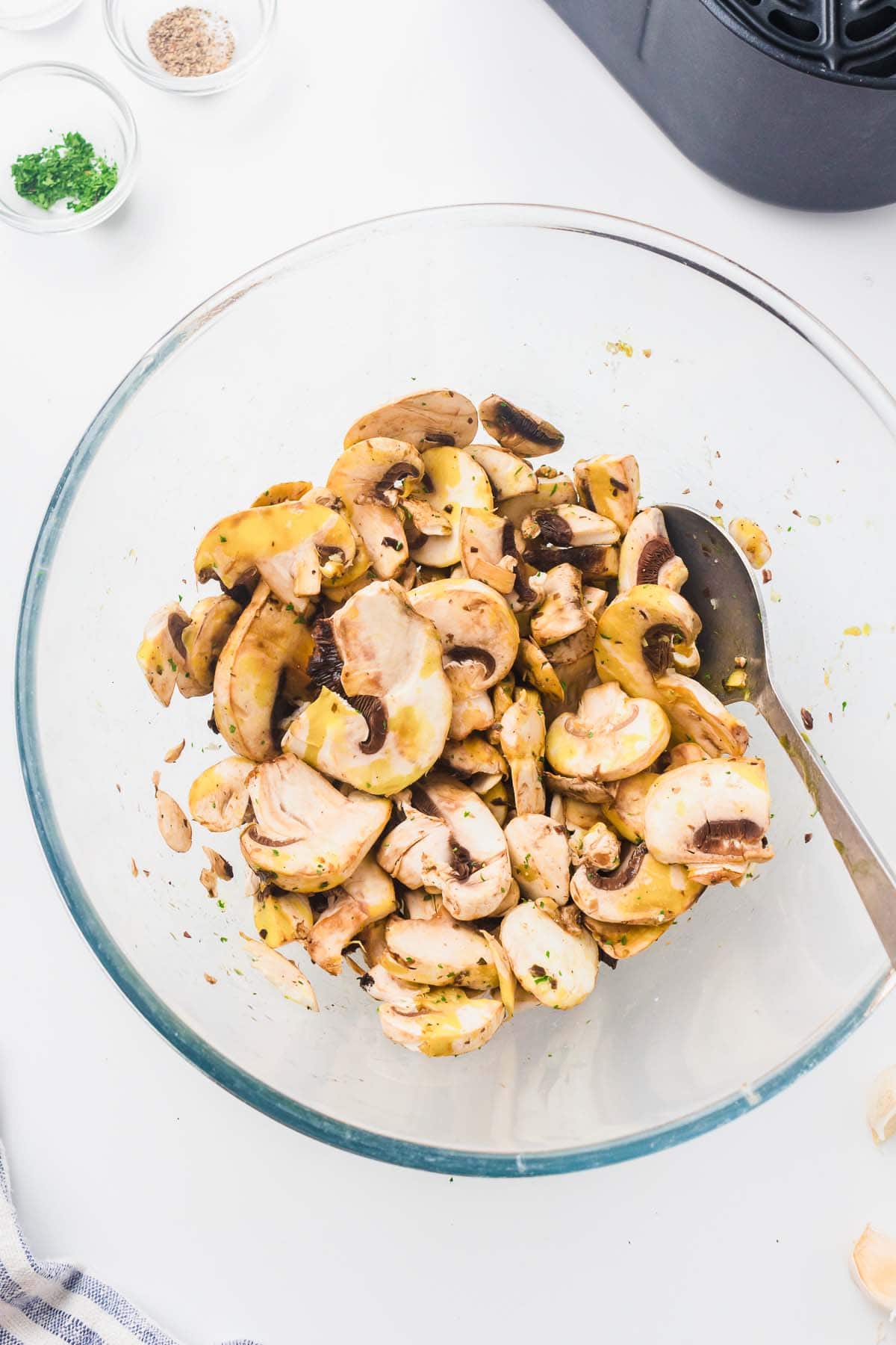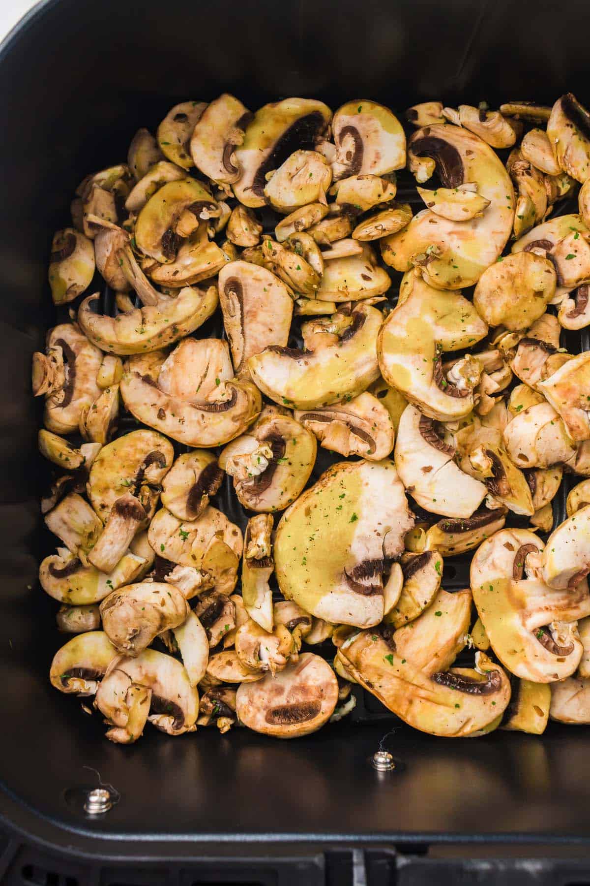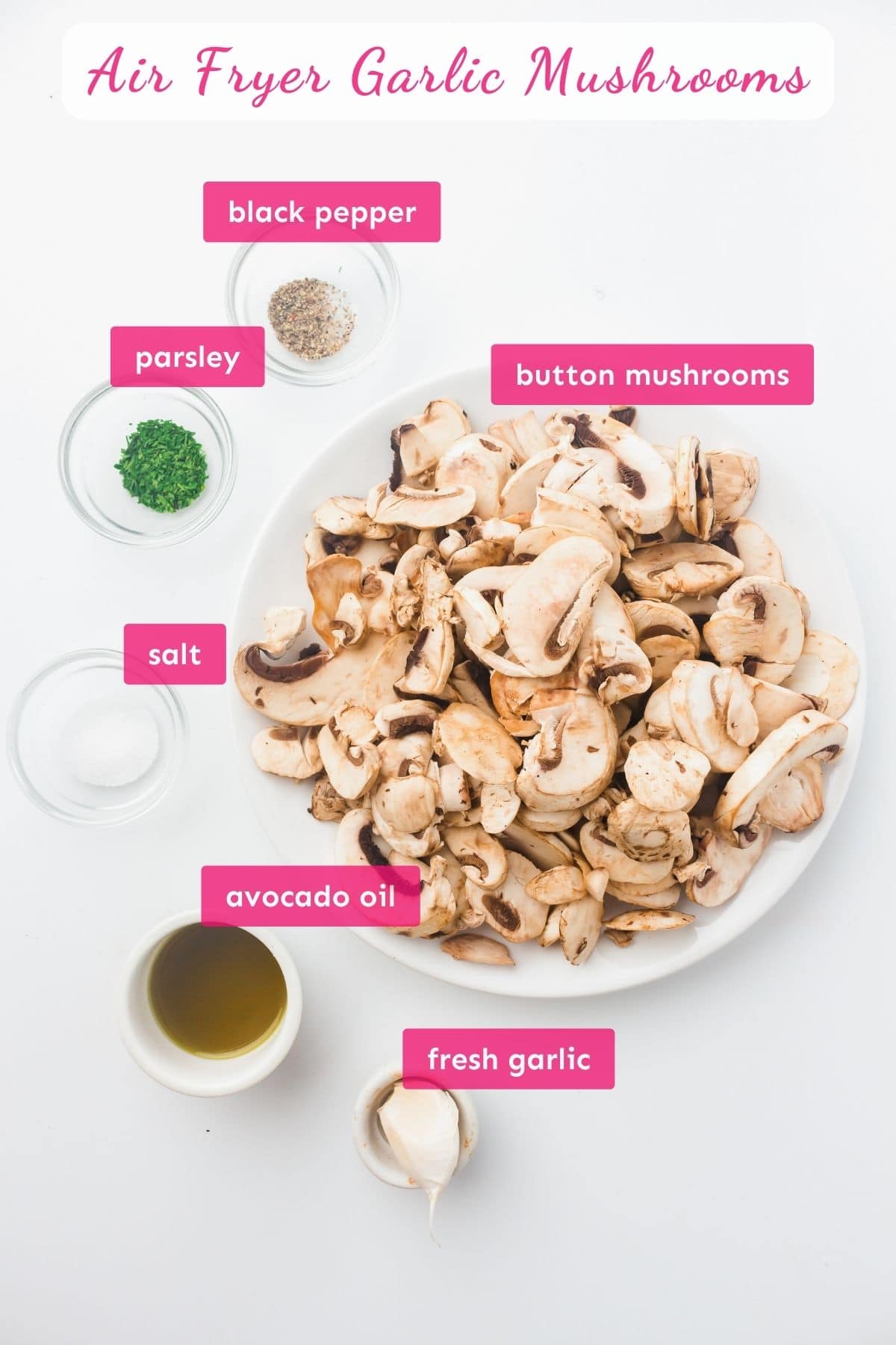 - Combine the sliced mushrooms, avocado oil, minced garlic, salt, black pepper, and dried parsley: Toss until evenly coated.9 ounces sliced button mushrooms, 1 garlic clove, ½ teaspoon salt, ¼ teaspoon black pepper, ¼ teaspoon dried parsley, 1 tablespoon avocado oil