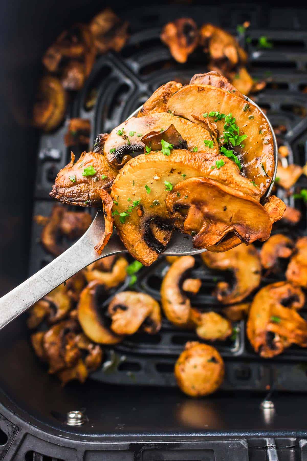 ♥ The texture contrast is what makes these better than average versions. The air fryer cooks off excess moisture fast. That gives you golden edges and juicy centers instead of soggy mushrooms like you often get on the stovetop.
