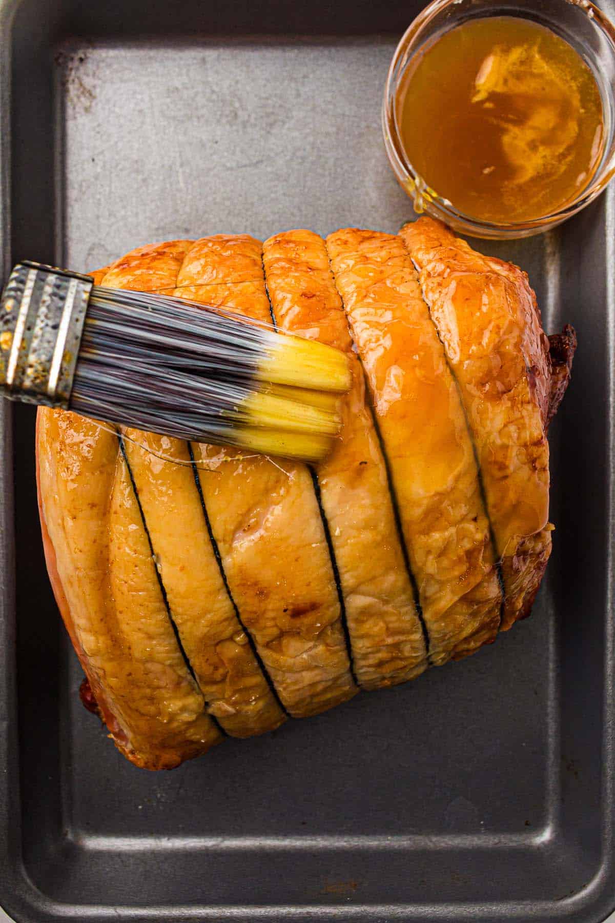 - Brush the glaze generously over the surface of the ham. Return the ham to the oven uncovered.