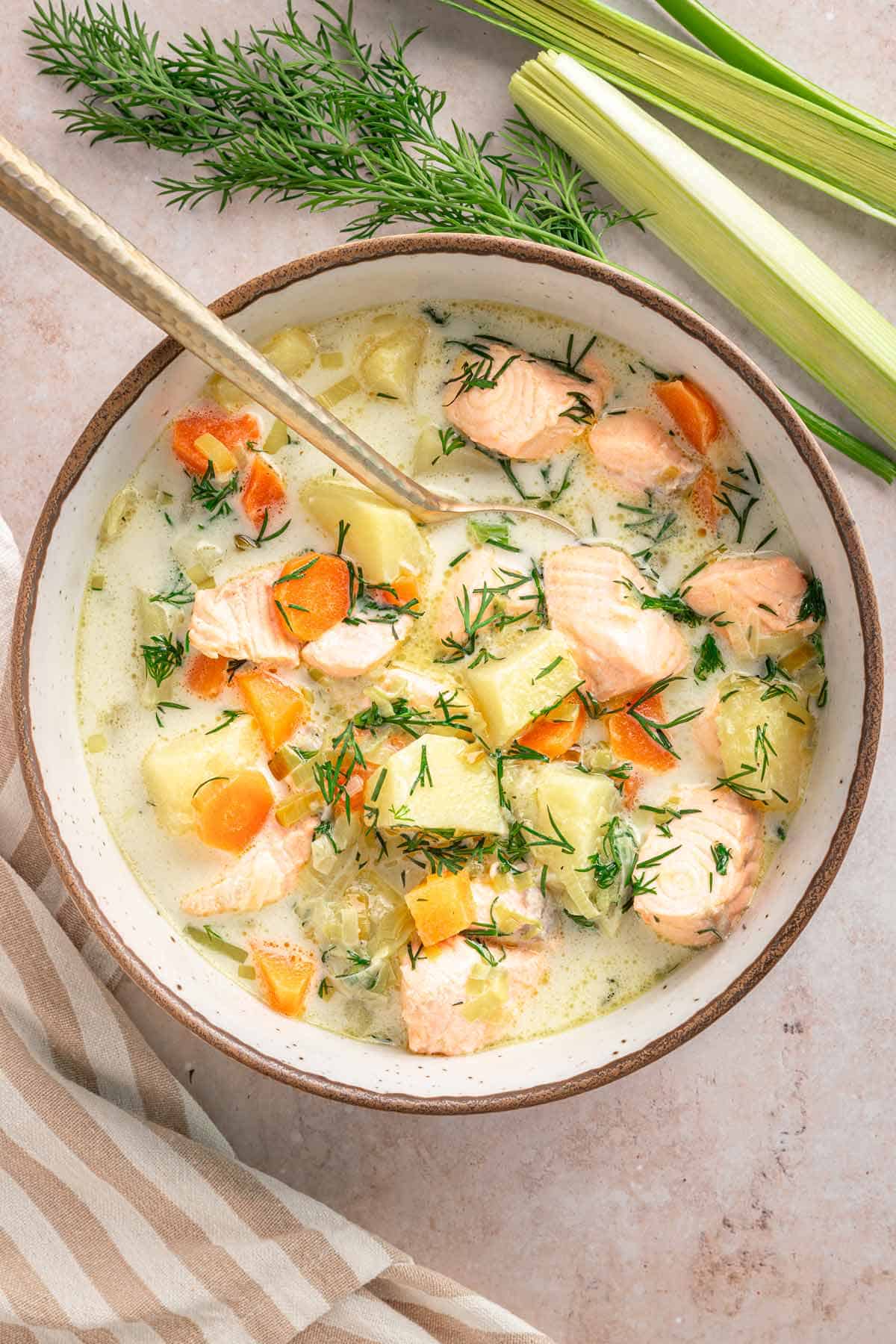 The salmon stays perfectly tender, the potatoes make it hearty, and the fresh dill gives it that bright flavor that makes you go back for another bowl.