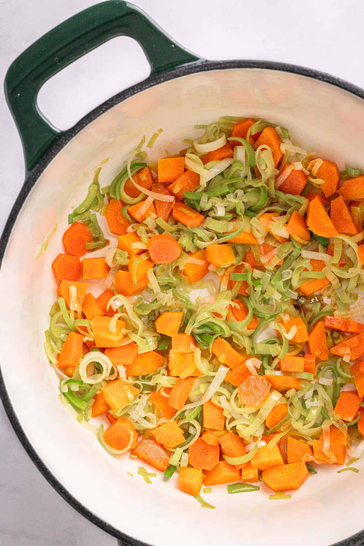 - Start the base: Melt butter in a medium pot over medium heat. Add sliced leek and carrots. Cook for about 5 minutes, stirring occasionally, until softened and fragrant.