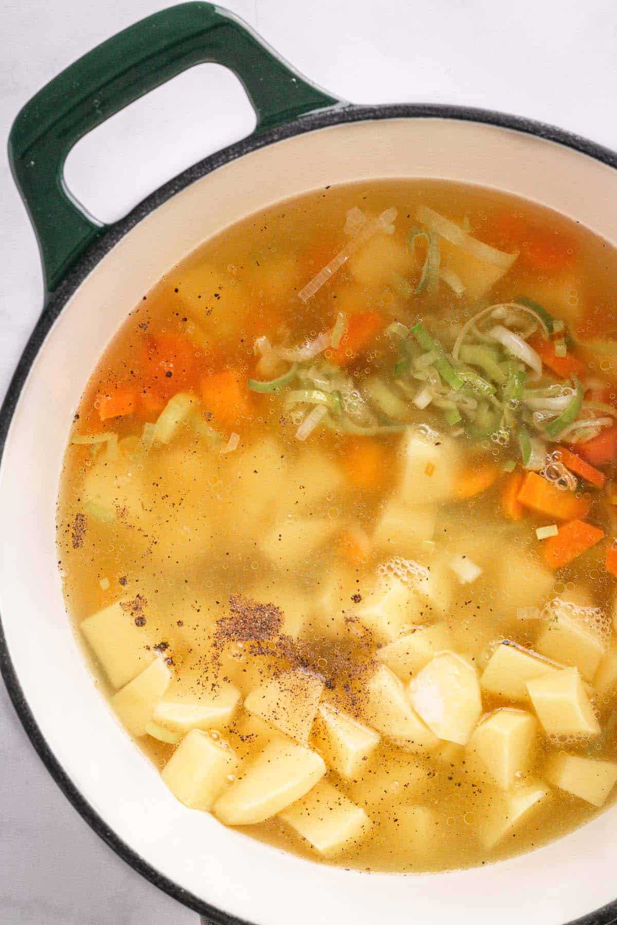 - Cook the vegetables: Add potatoes, salt, pepper, and broth. Bring to a boil, then reduce heat, cover, and simmer for 10-15 minutes, until tender.