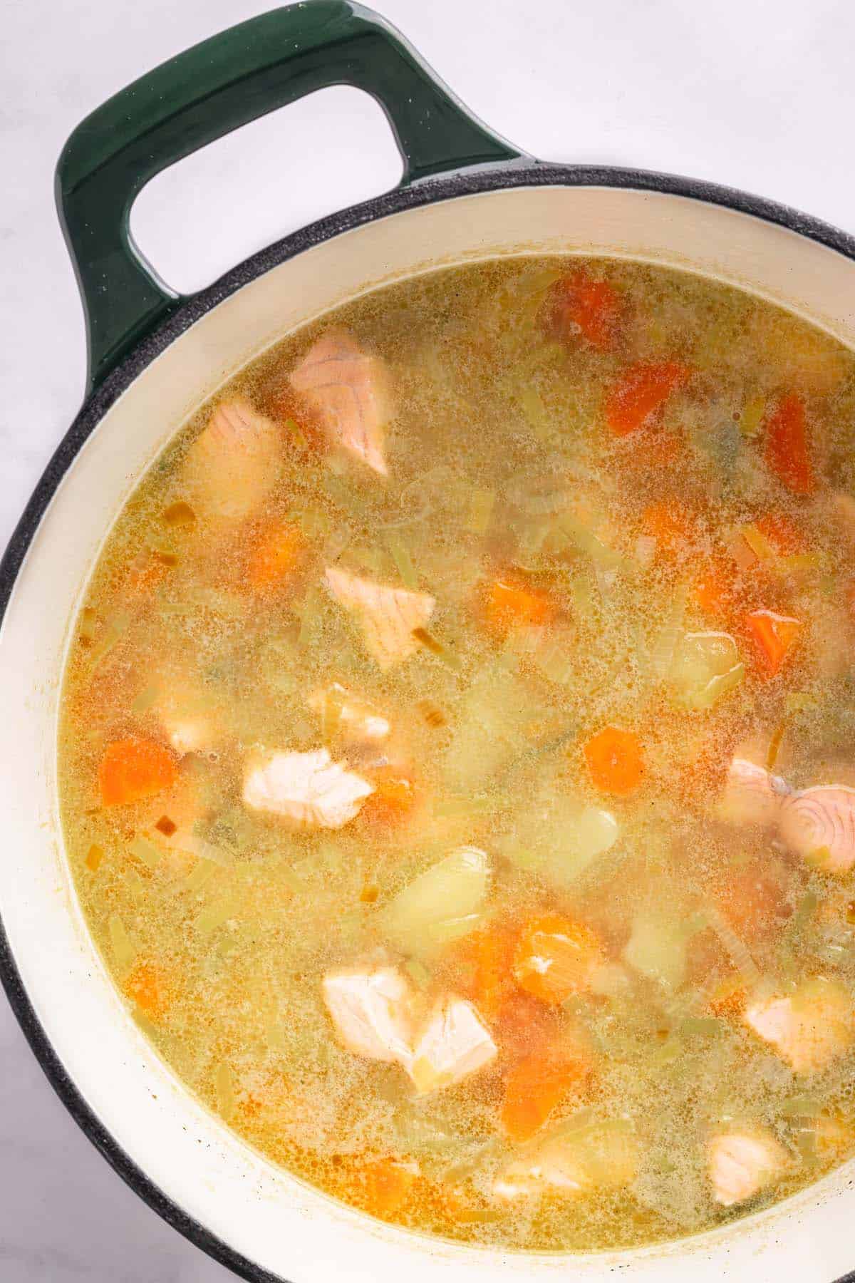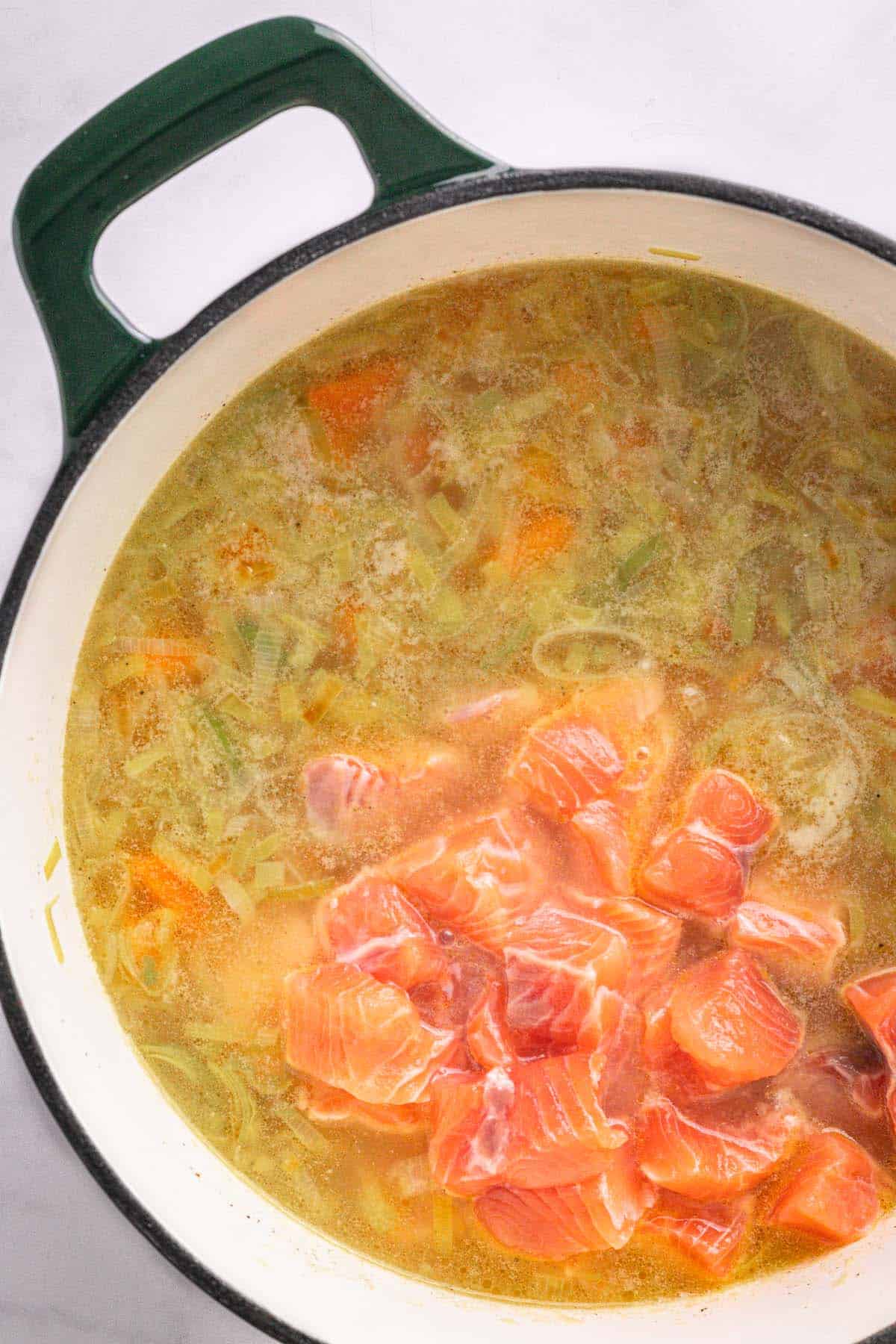 Frozen salmon works too - just thaw it completely in the fridge overnight and pat it dry before using. This helps prevent excess water from thinning the soup.