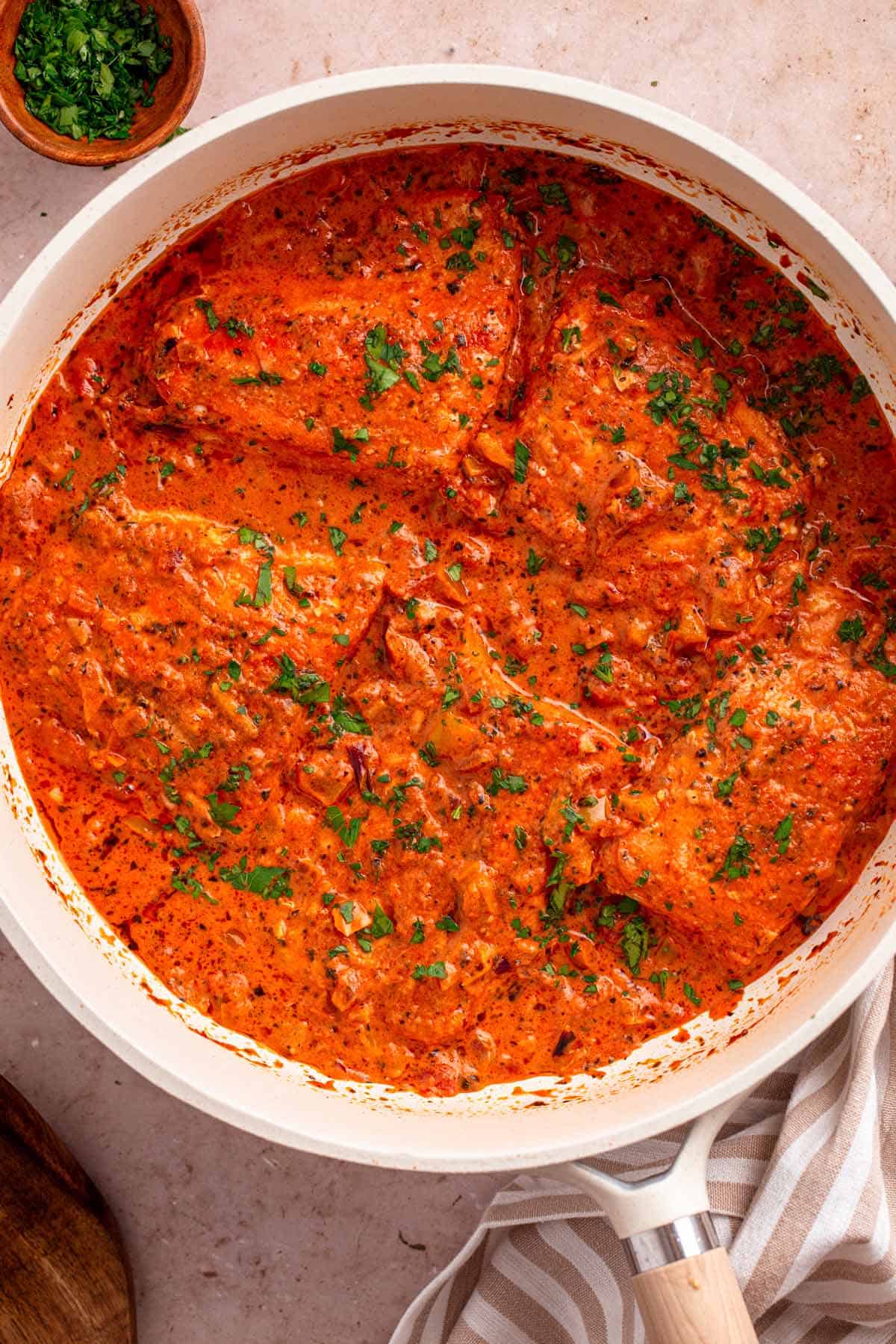 This creamy tomato salmon skillet is one of those dinners that looks fancy but takes almost no effort. It’s quick, low carb, and family-friendly! Ready in less than 30 minutes. I love how the salmon gets tender and flaky while soaking up that garlicky, creamy tomato sauce.