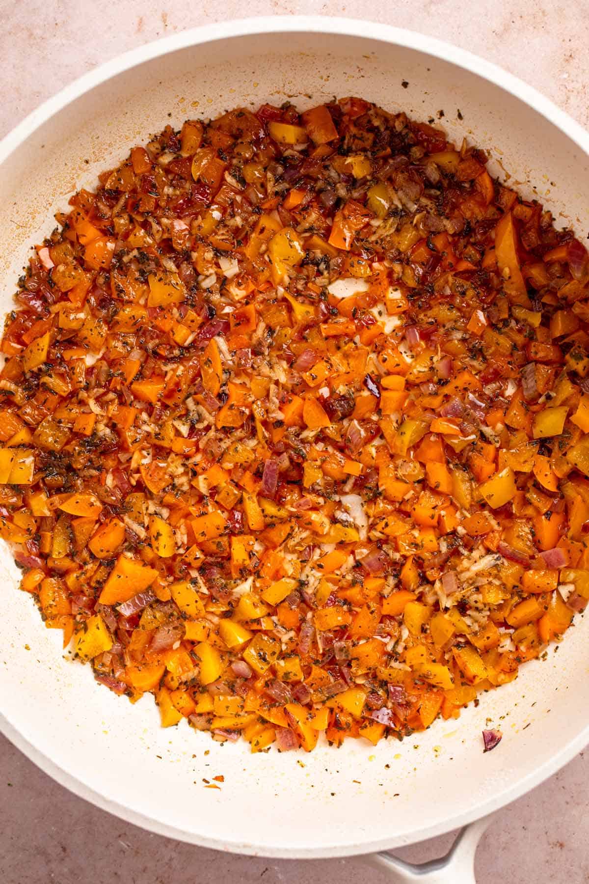 - Cook the veggies: Lower the heat, add remaining oil, then sauté bell peppers and onions until soft. Add herbs. Add garlic and cook for 30 seconds.