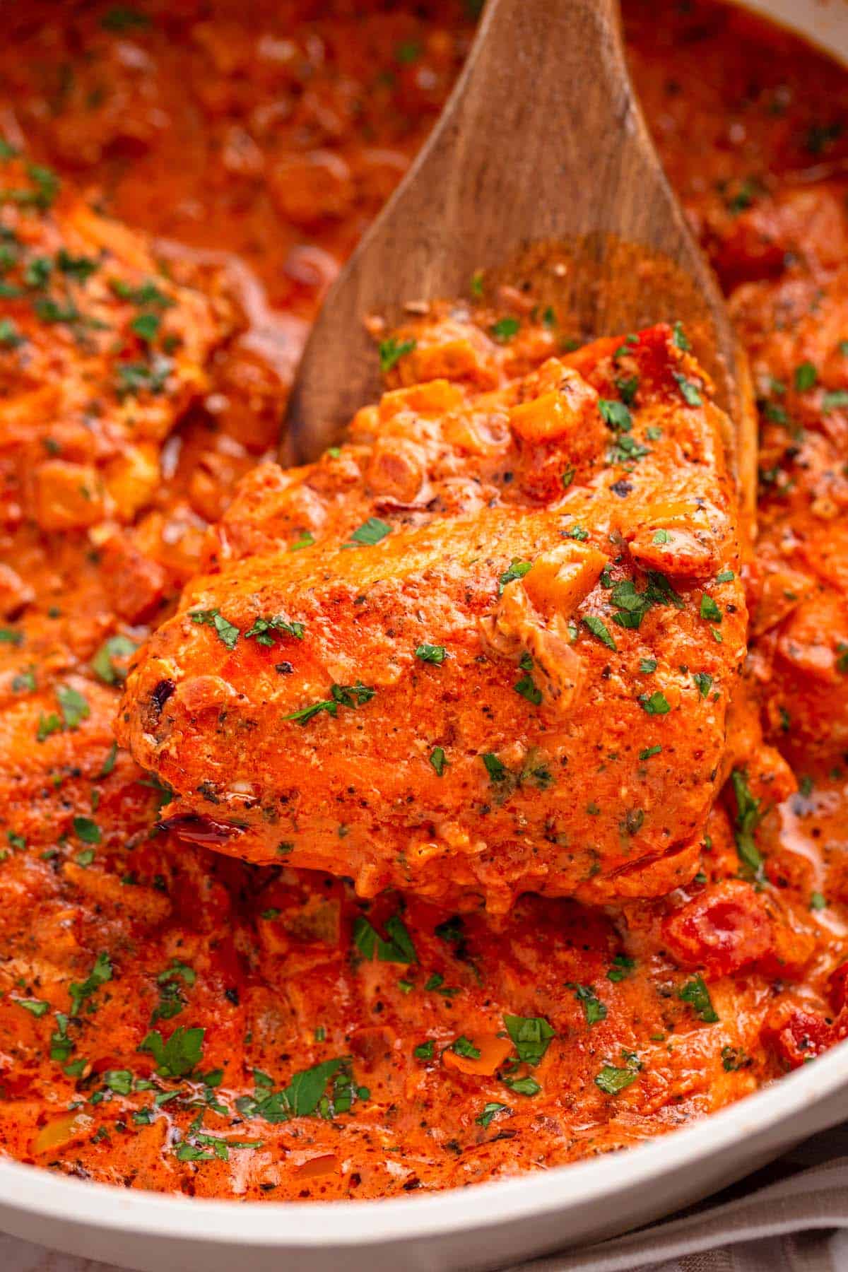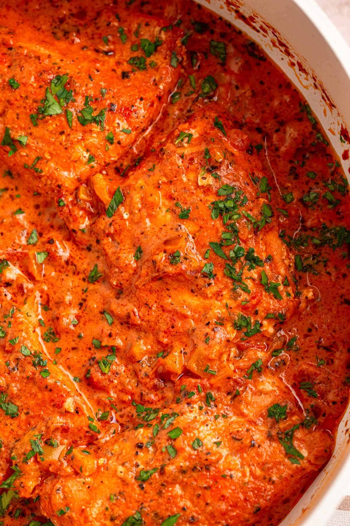 This creamy tomato salmon skillet is one of those dinners that looks fancy but takes almost no effort. It’s quick, low carb, and family-friendly! Ready in less than 30 minutes. I love how the salmon gets tender and flaky while soaking up that garlicky, creamy tomato sauce.