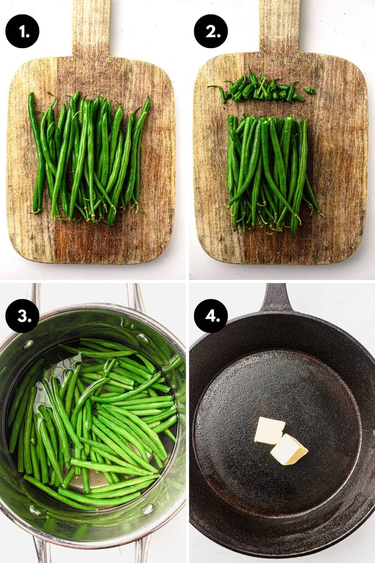 - Add green beans and cook 3–4 minutes until bright green and just tender. Drain immediately and set aside.1½ pounds fresh green beans