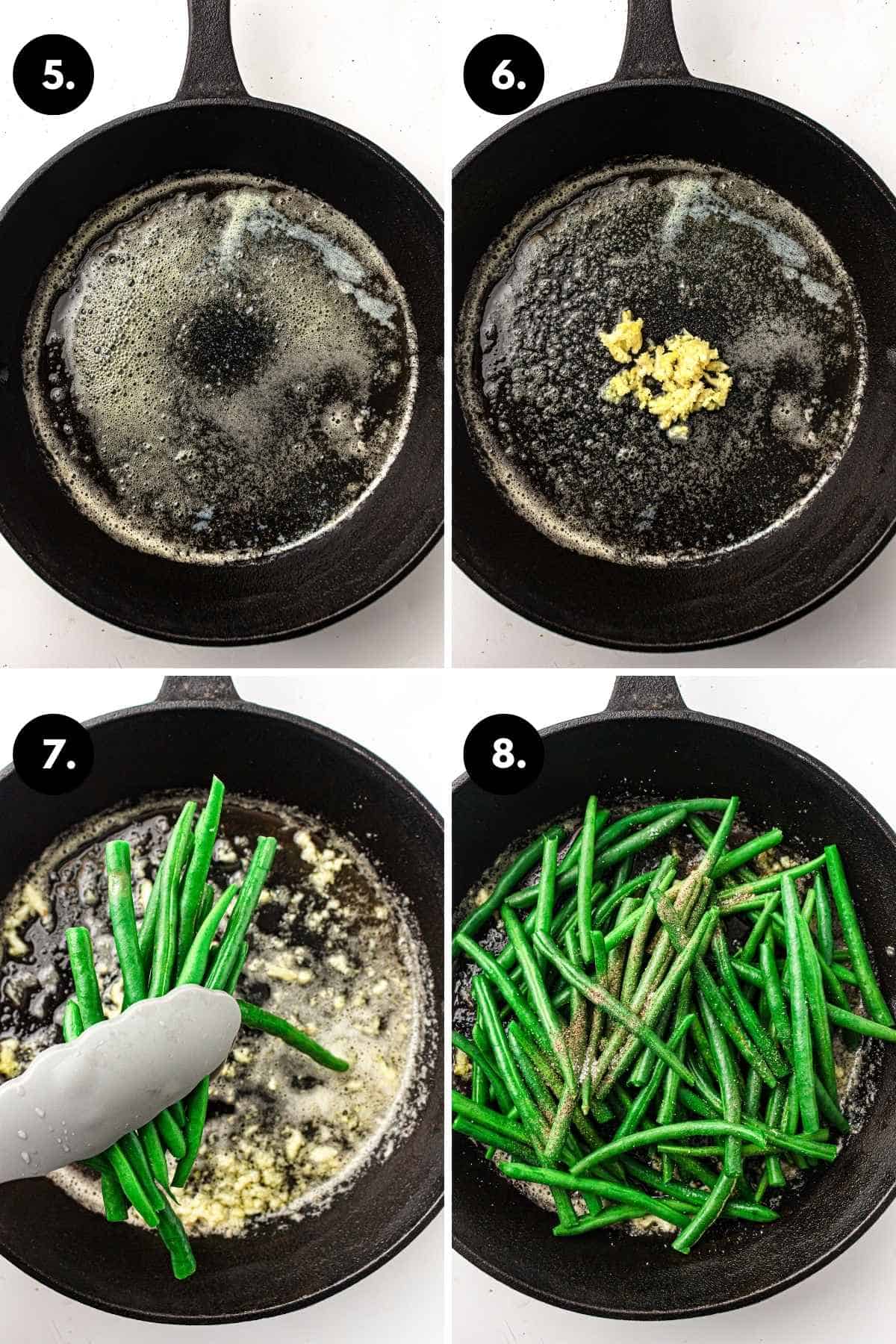 - Add green beans to skillet. Sprinkle with salt and black pepper.½ teaspoon salt, ¼ teaspoon black pepper