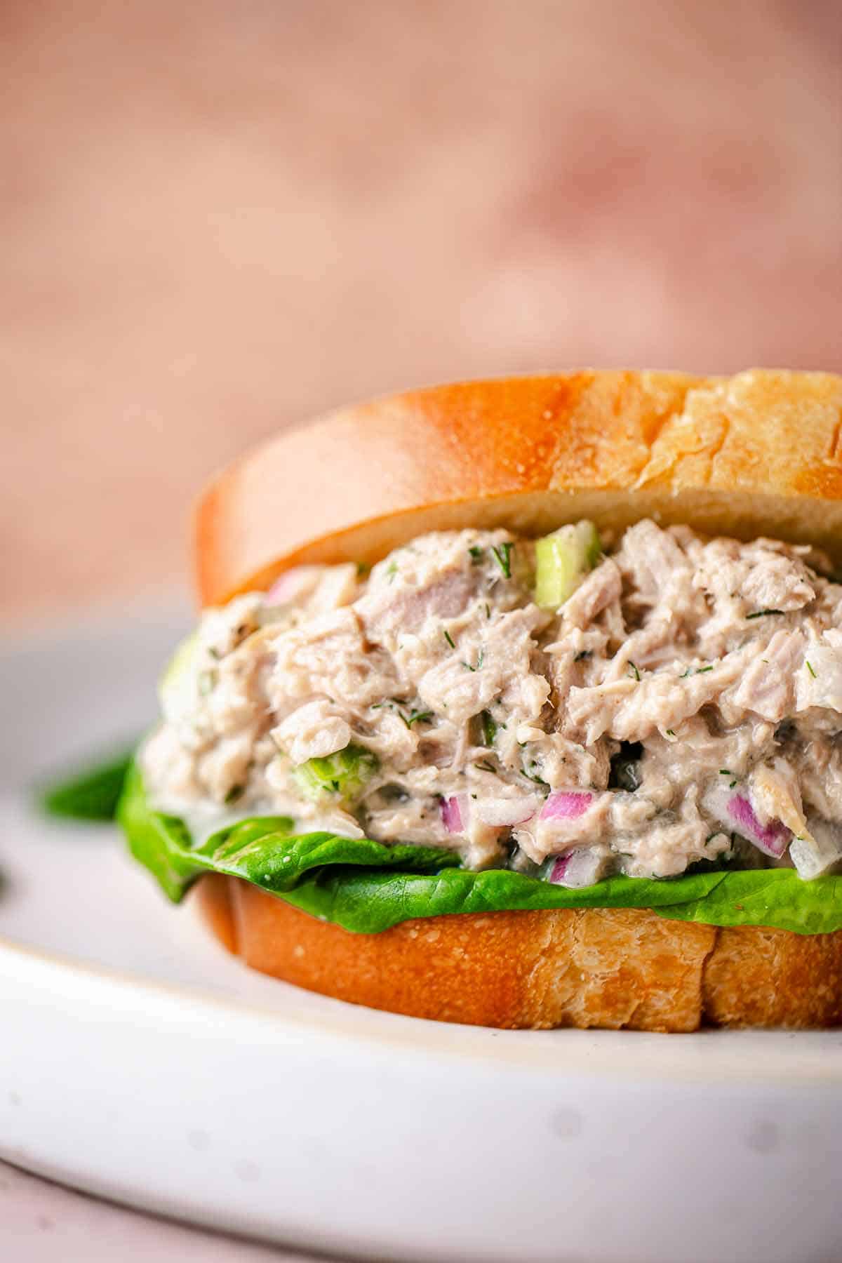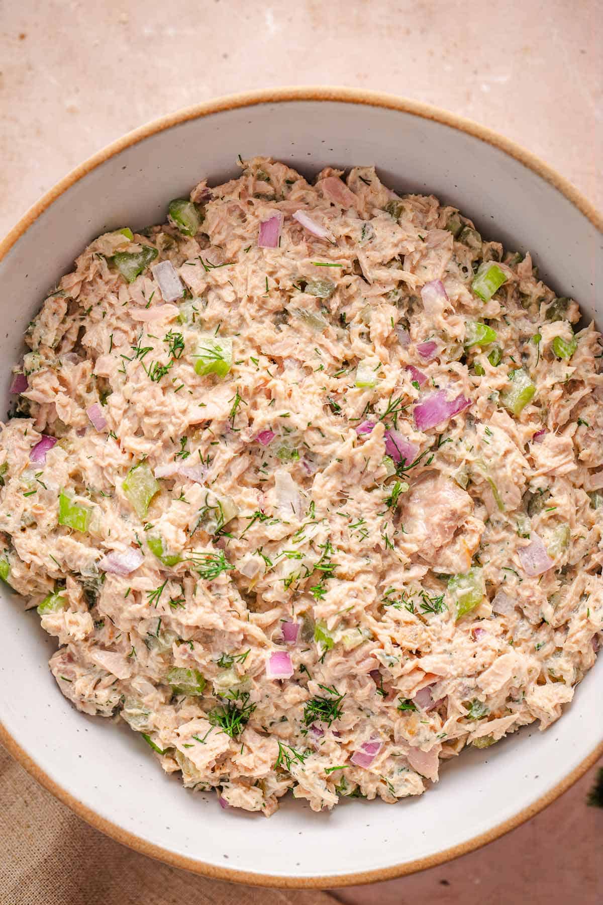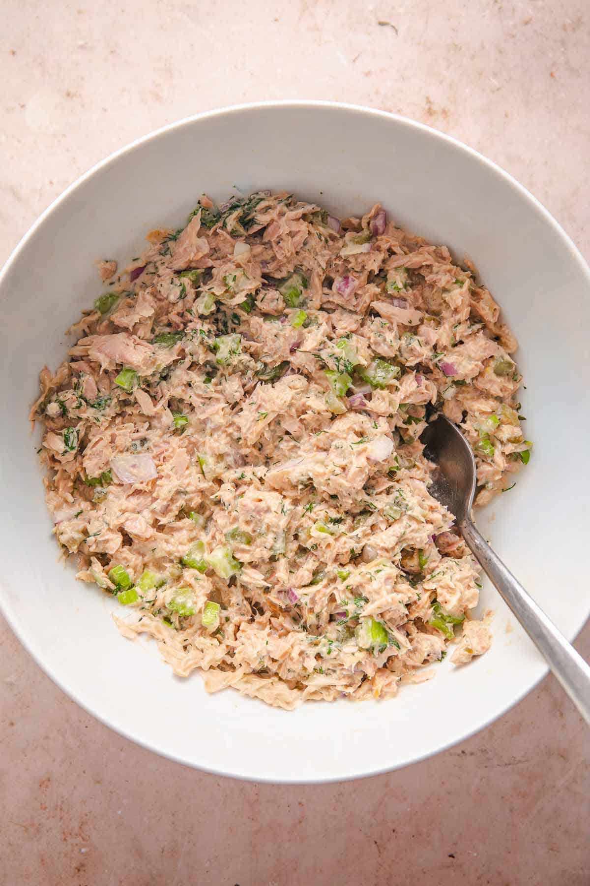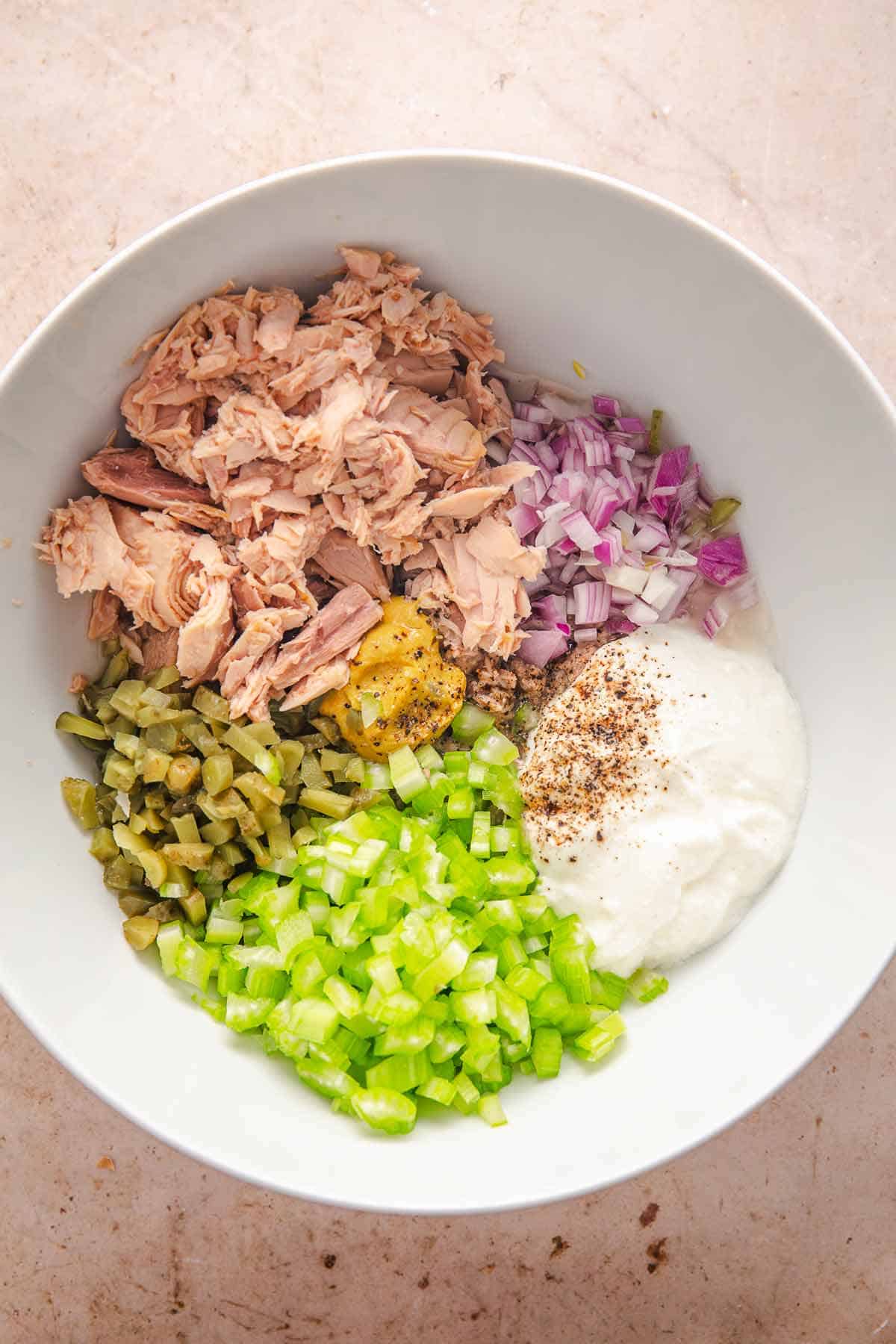 - Combine everything in a mixing bowl.2 cans (5 ounces) tuna in water, 2 celery stalks, 3 tablespoon red onion, 1 tablespoon fresh dill or parsley, 1 tablespoon Dijon mustard, 2 tablespoon lemon juice, 3 tablespoon pickles, ⅓ cup Greek yogurt or mayonnaise, ½ teaspoon garlic powder