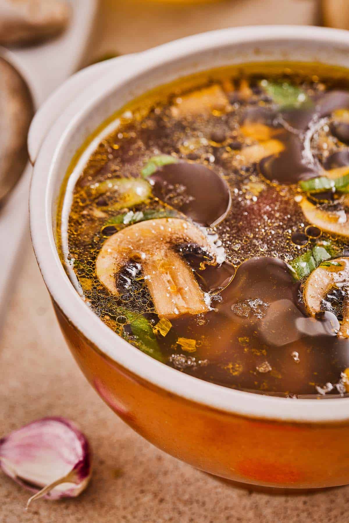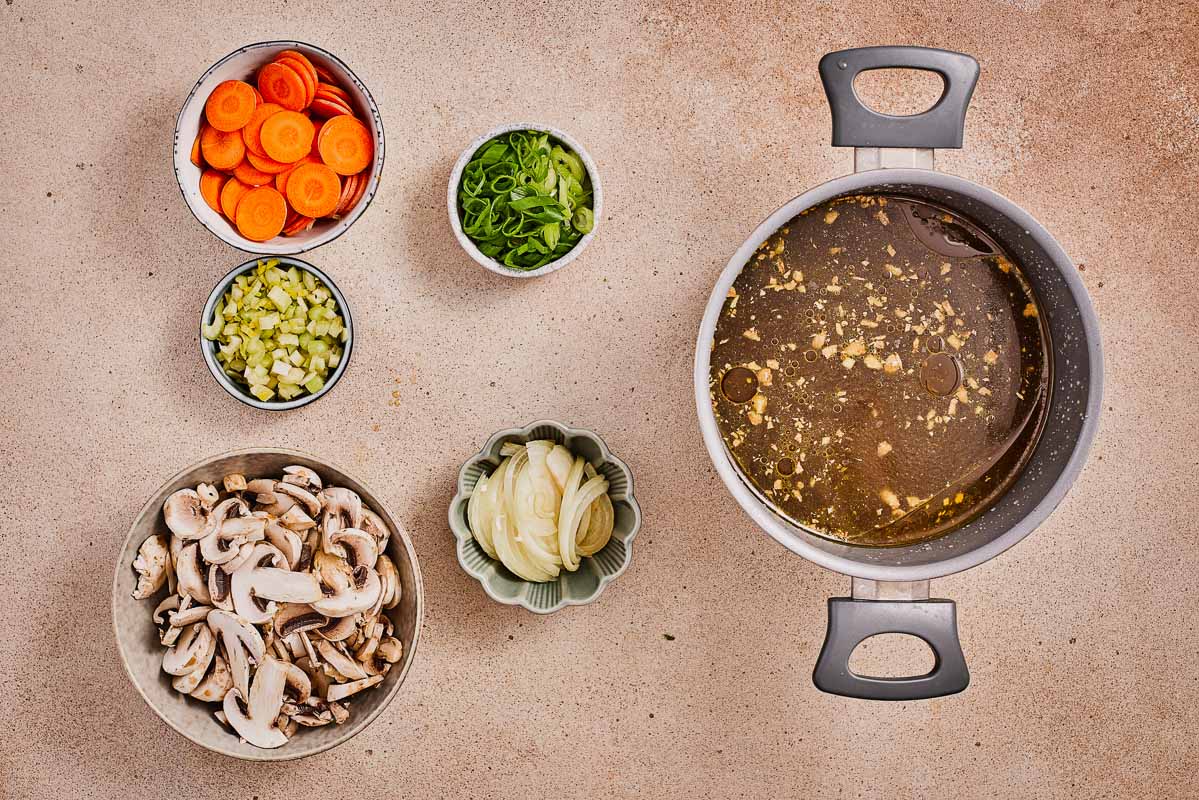 • Sharp chef’s knife - You’ll need this to slice the onion, carrot, celery, and mushrooms very thin. Thin cuts help the vegetables cook quickly and flavor the broth without overpowering it.