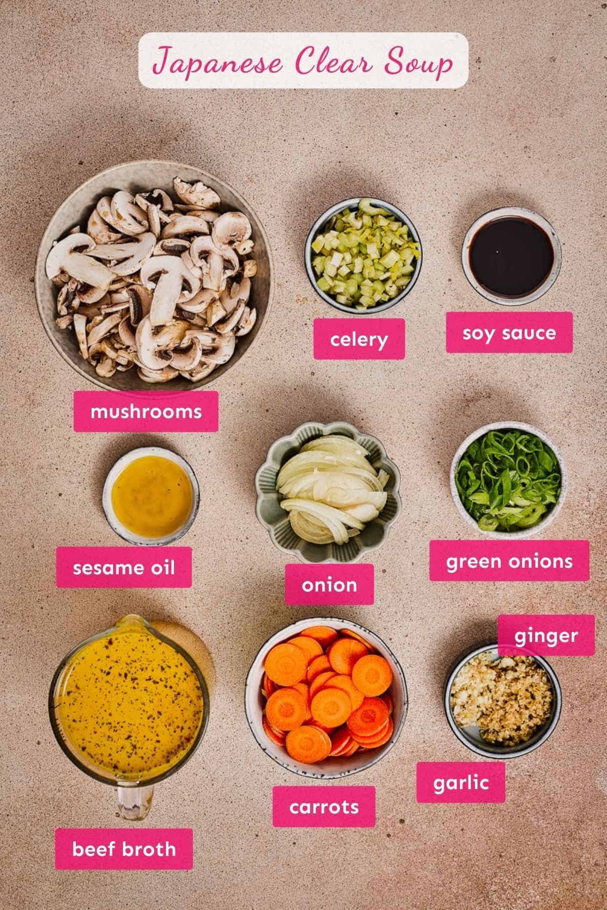 Homemade Japanese clear soup with sliced mushrooms, carrots, green onions, ginger, and soy sauce in a white bowl.