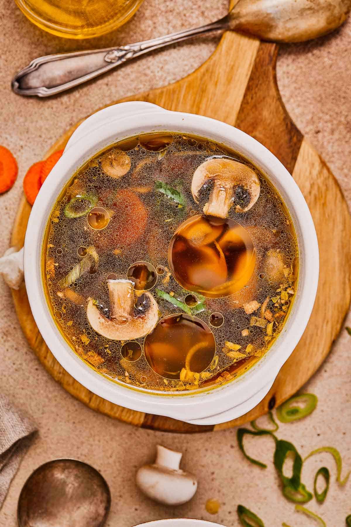 • Don’t skip skimming the foam. Clear broth is the goal. Removing impurities keeps the soup light, clean, and visually appealing.