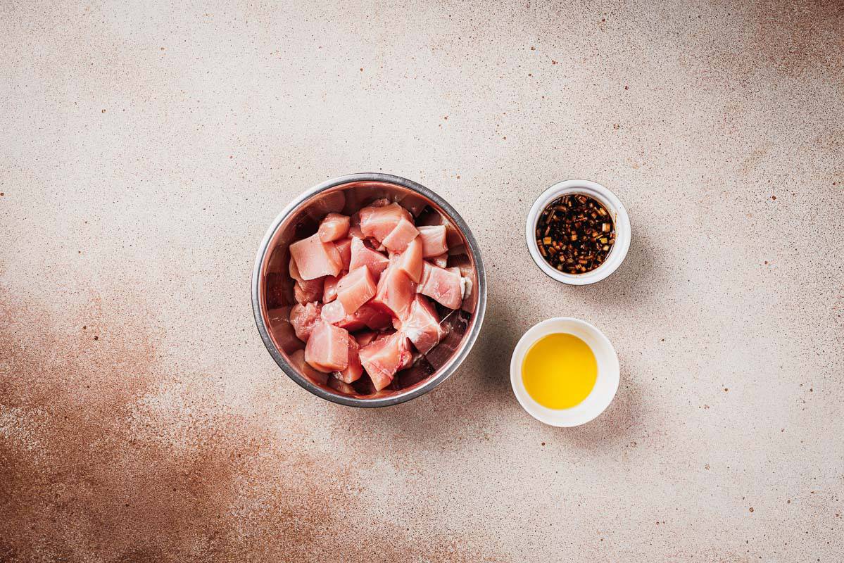 - Prep the chicken: Cut the chicken into small, bite-sized pieces or thin strips, about ¾ inch (2 cm), so it cooks quickly and evenly.