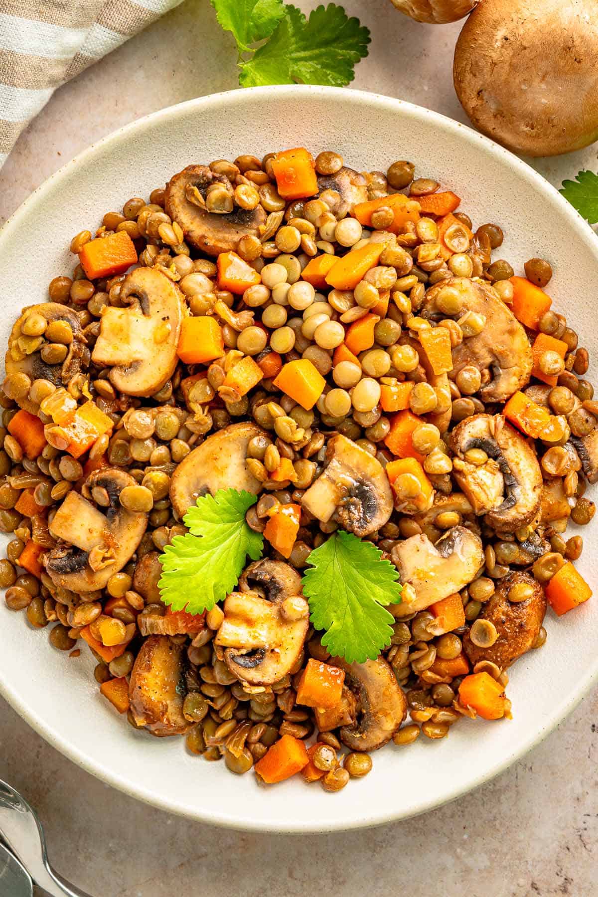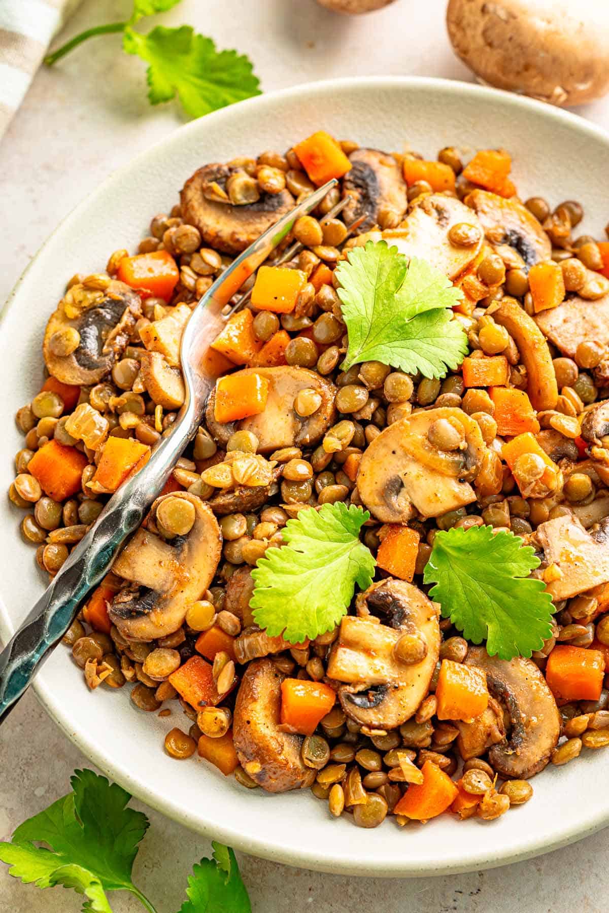 Lentils with mushrooms is a quick, hearty plant based dinner packed with savory flavor.
