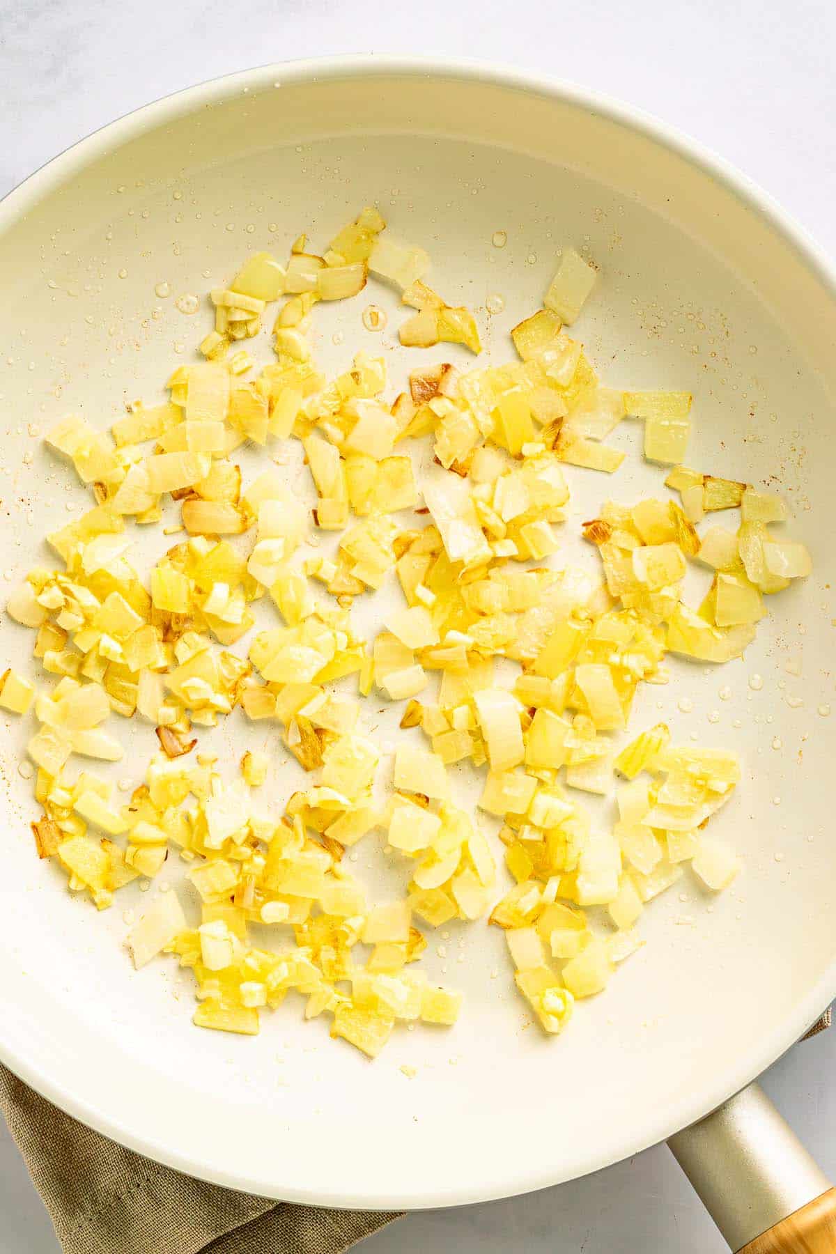 - Start the aromatics: Heat 1 tablespoon olive oil in a large skillet over medium heat. Add diced onion and cook for about 2 minutes until slightly soft.