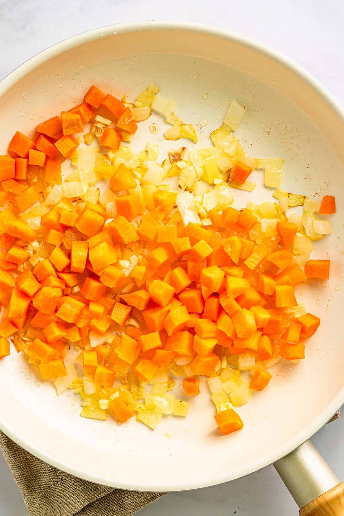 - Cook the carrots: Add diced carrots and cook for 3 to 4 minutes. They should begin to soften but still hold shape.