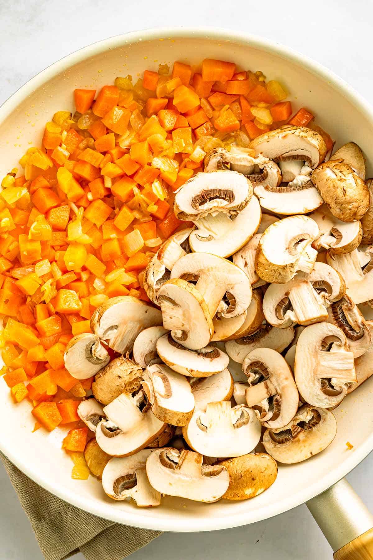 - Add mushrooms: Stir in sliced cremini mushrooms. Cook for 5 to 6 minutes, stirring occasionally, until the mushrooms release their moisture and start to brown.