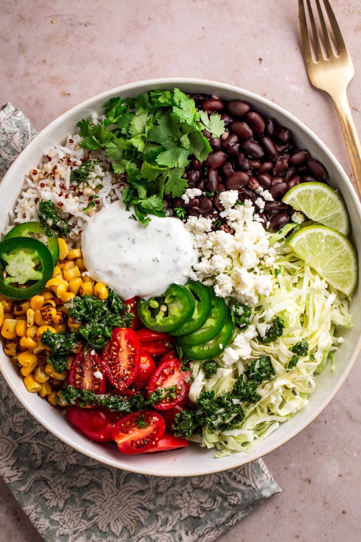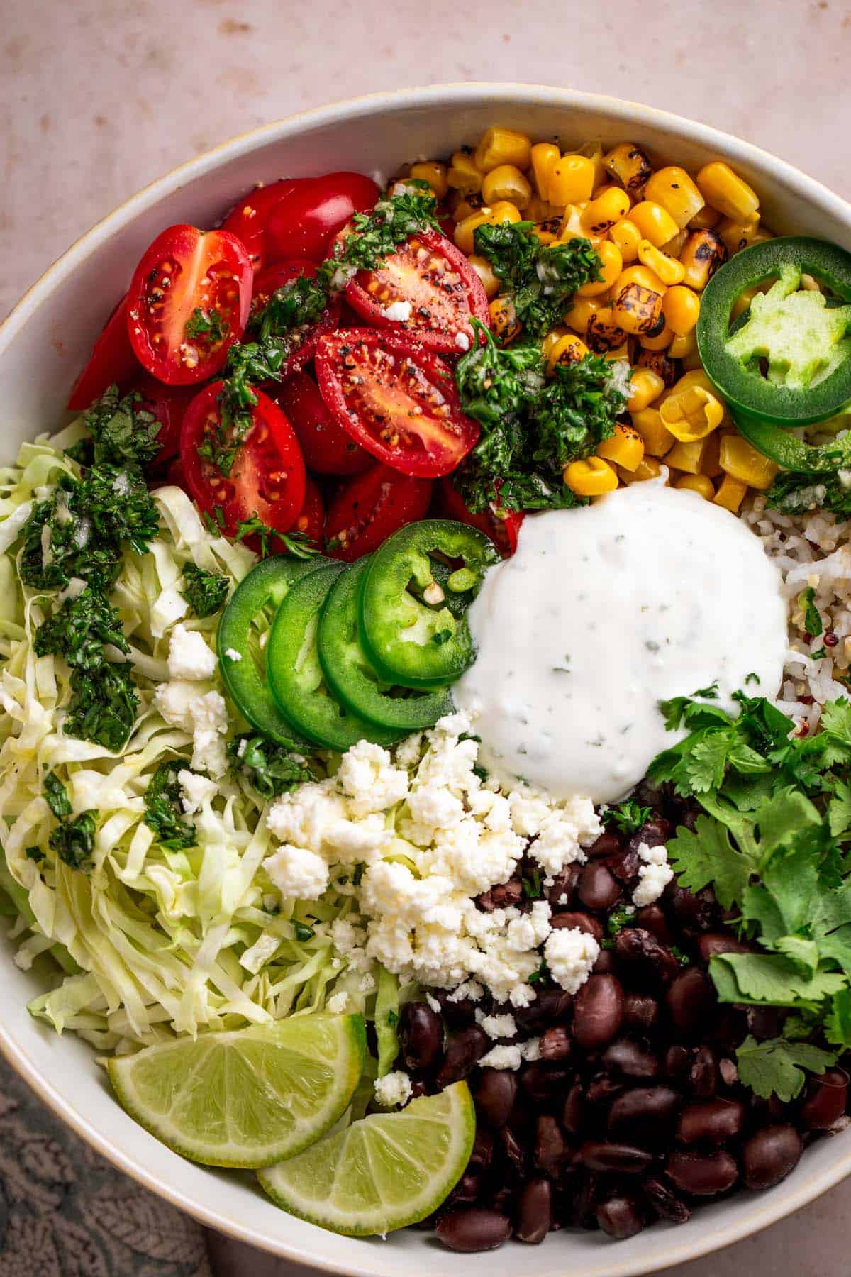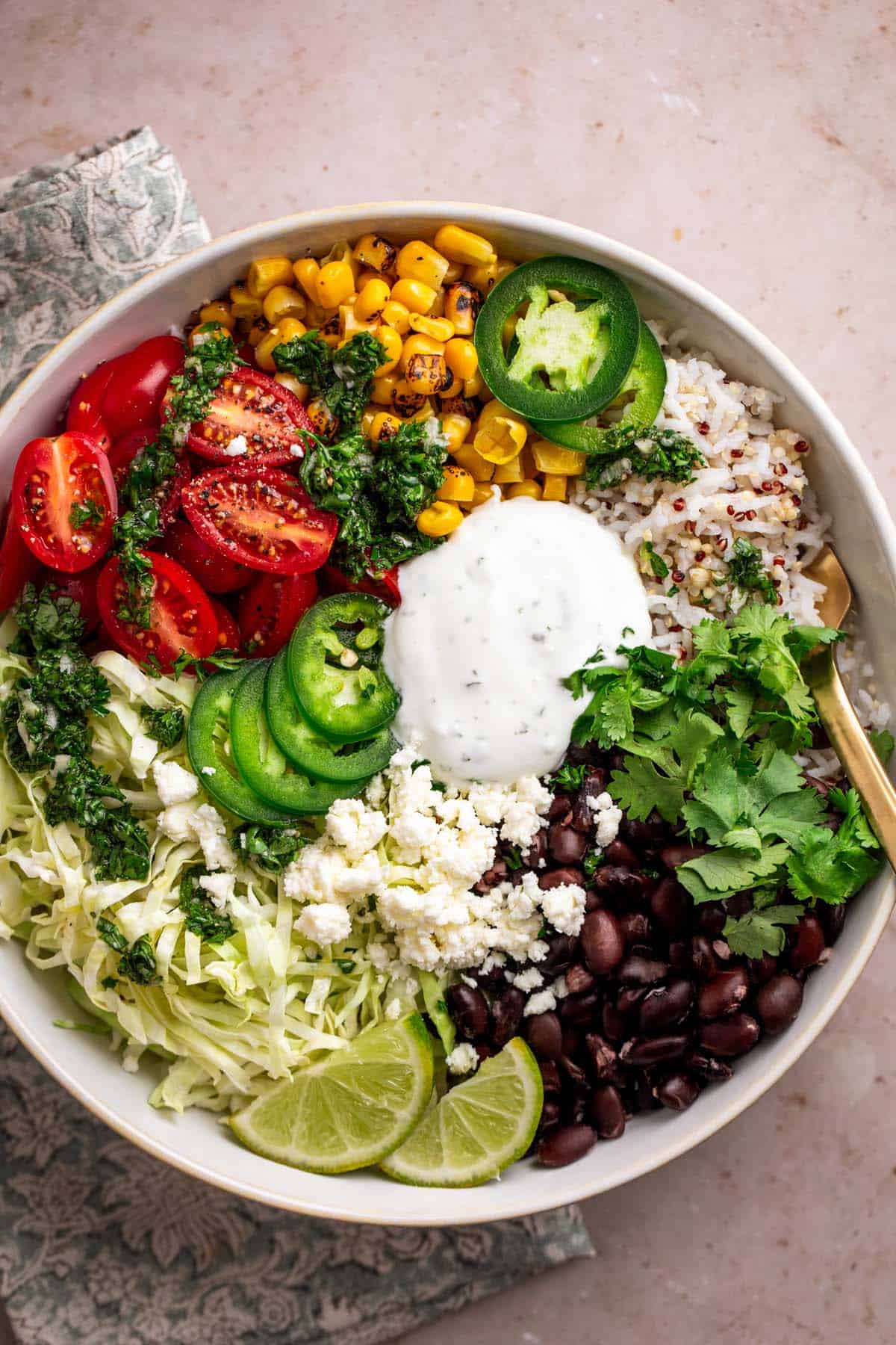 - Assemble the bowl: Divide the quinoa and rice between serving bowls. Add black beans, cherry tomatoes, corn, jalapeno, cabbage, cheese, and cilantro.¾ cup cherry/plum tomatoes, ½ cup grilled corn, ½ cup crumbled cotija, ½ can about 8 ounces black beans