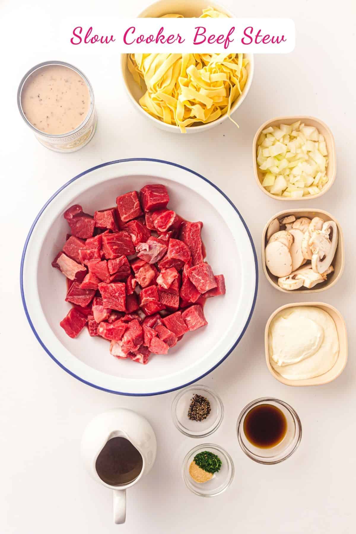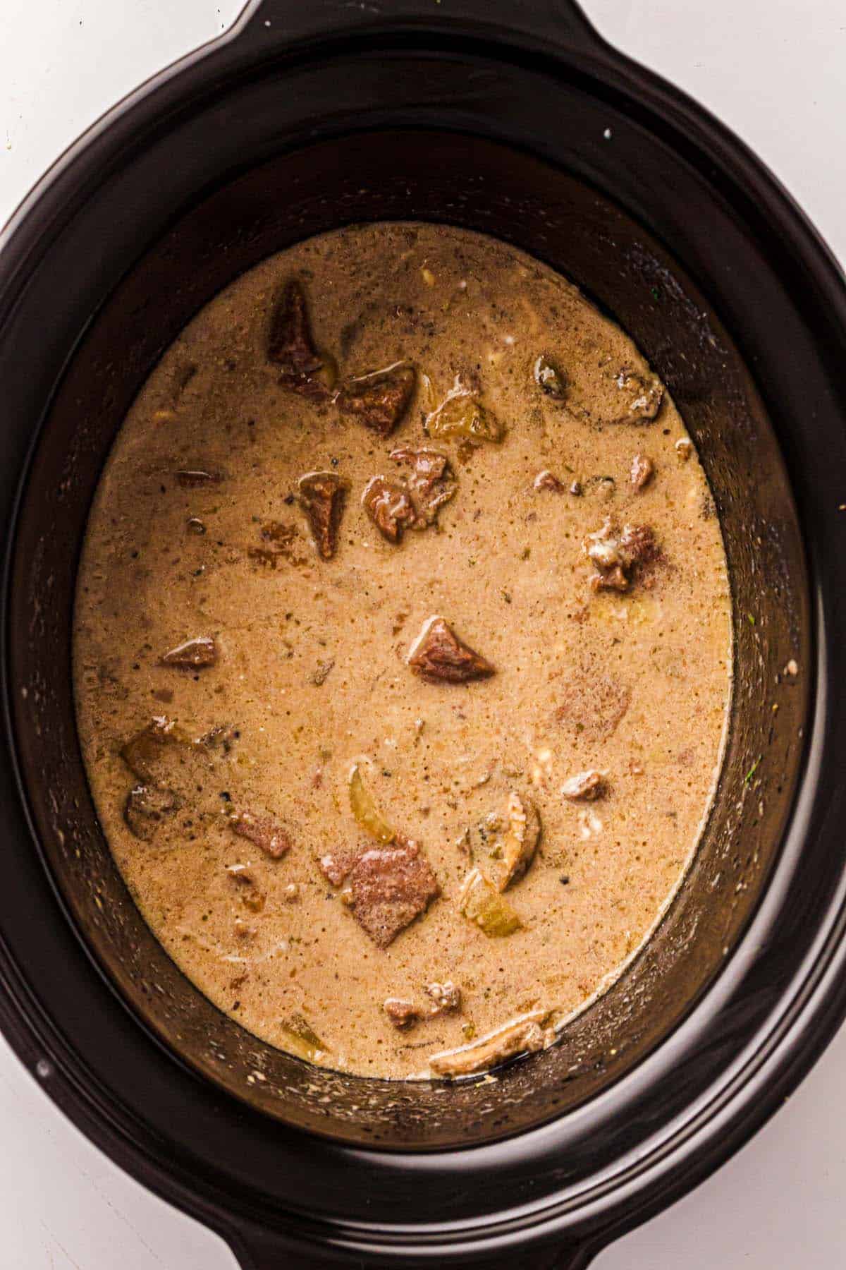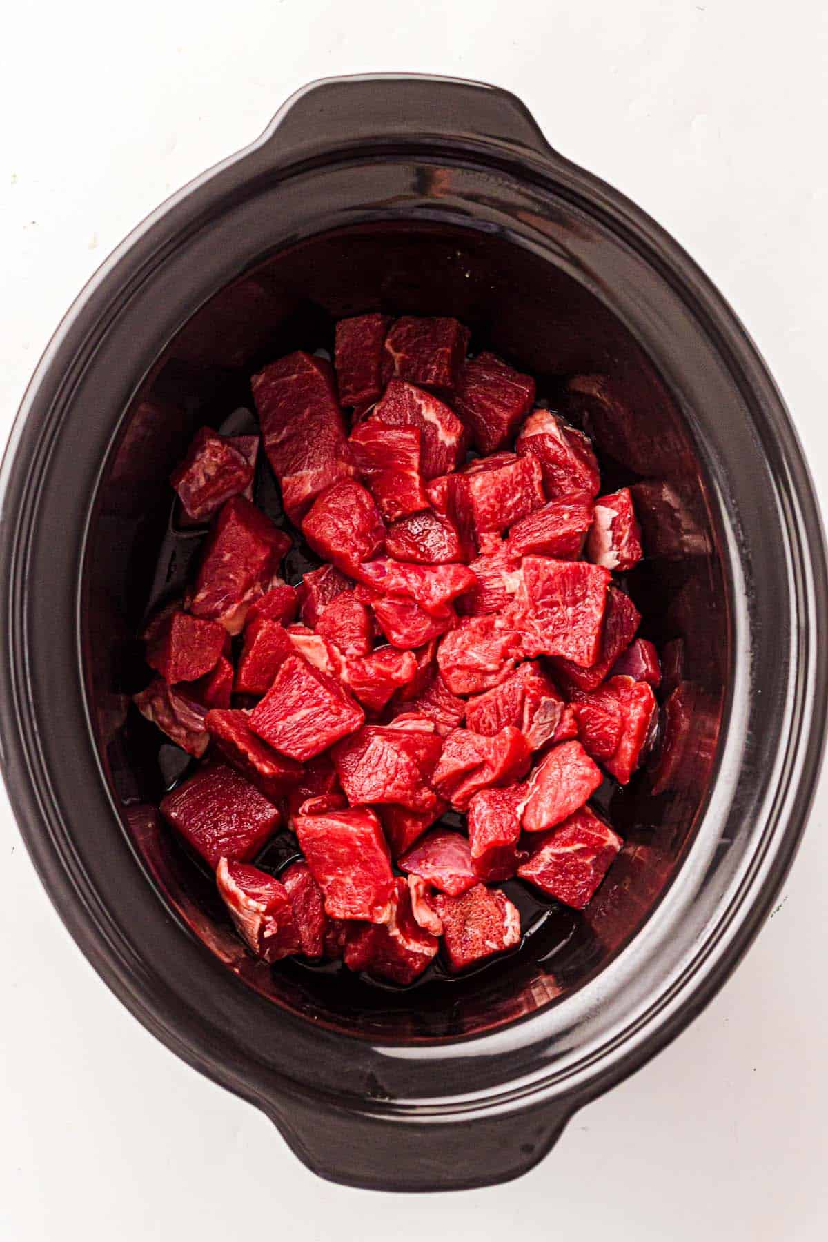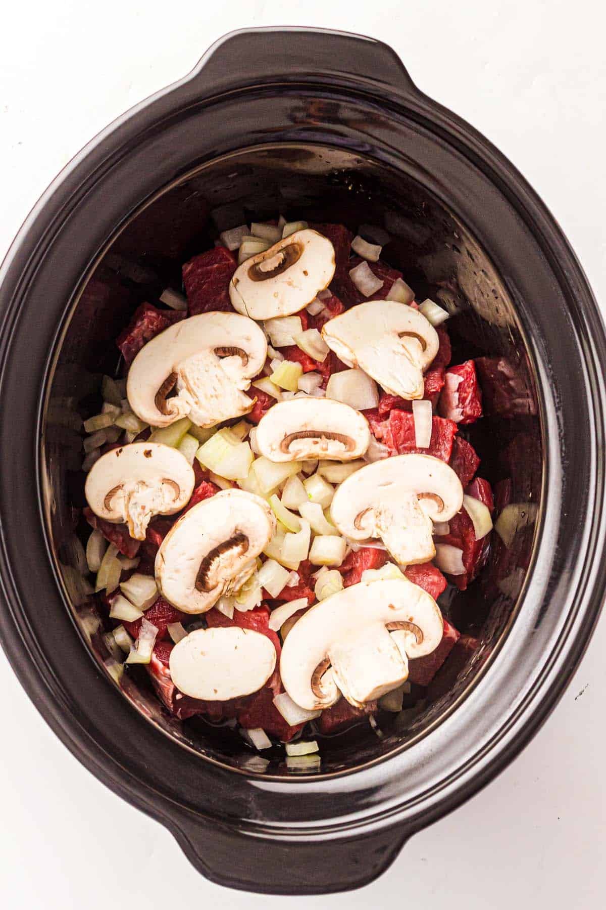 - Add beef and onion: Place beef cubes and diced onion into the slow cooker.