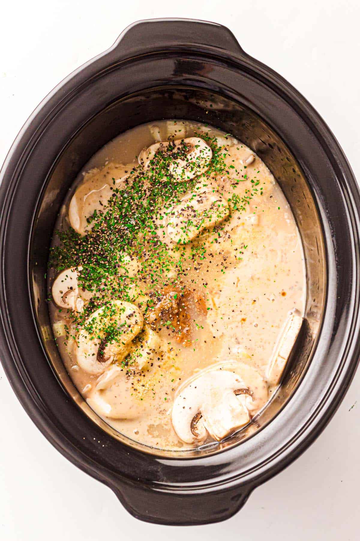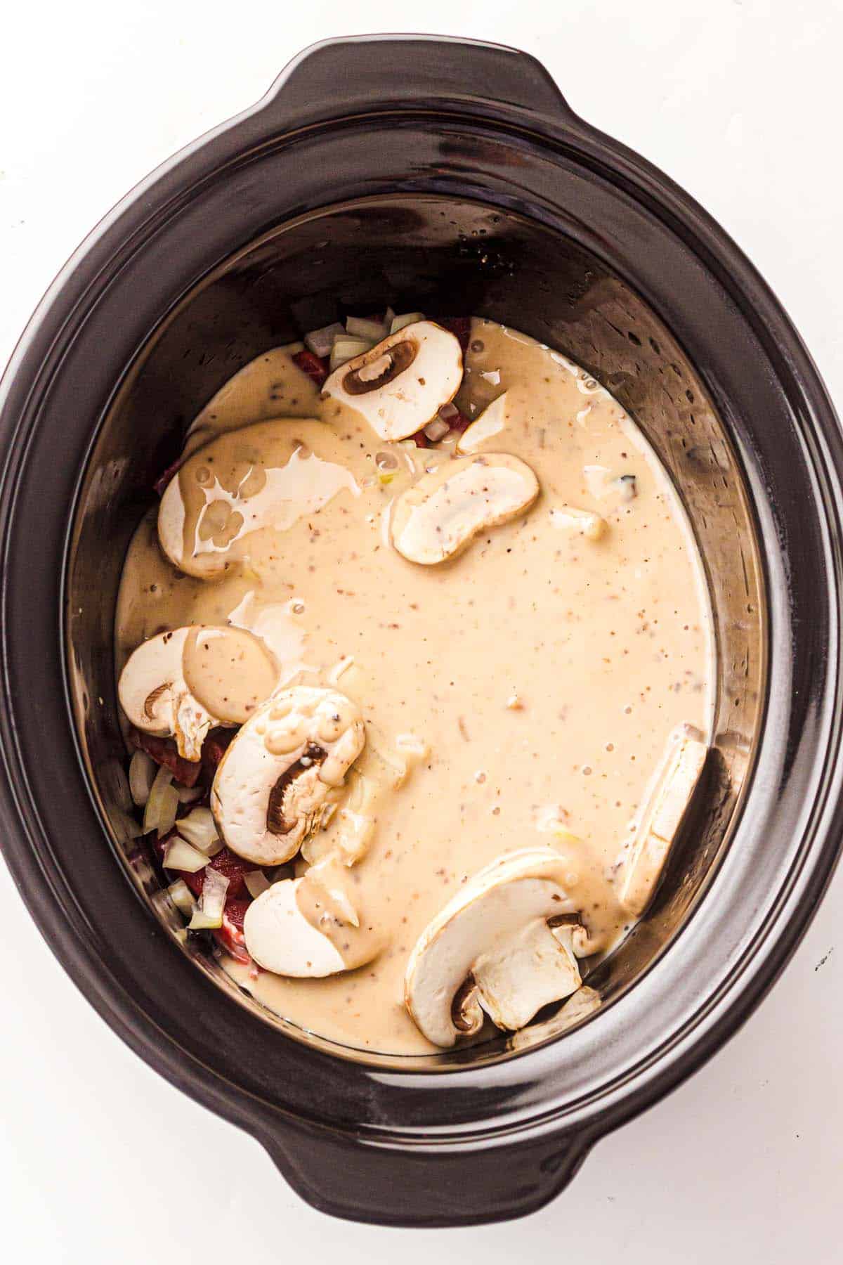 - Add the sauce ingredients: Add cream of mushroom soup, beef broth, Worcestershire sauce, garlic powder, salt, pepper, and parsley. Stir gently until combined. The mixture will look thick. That’s normal.