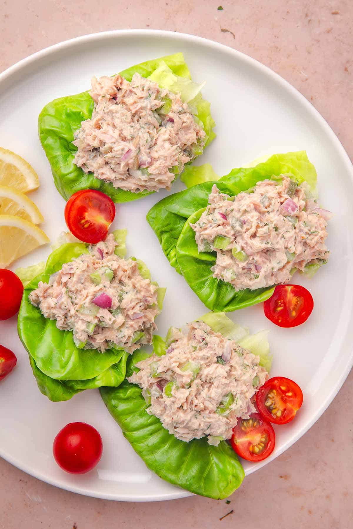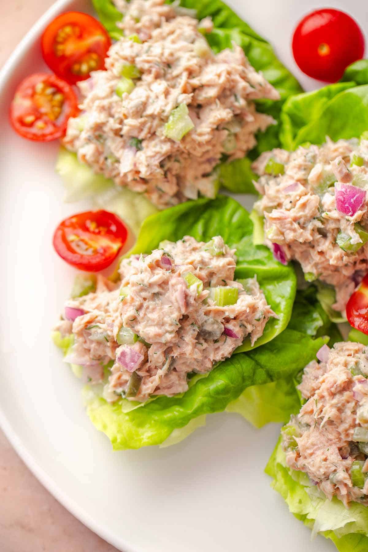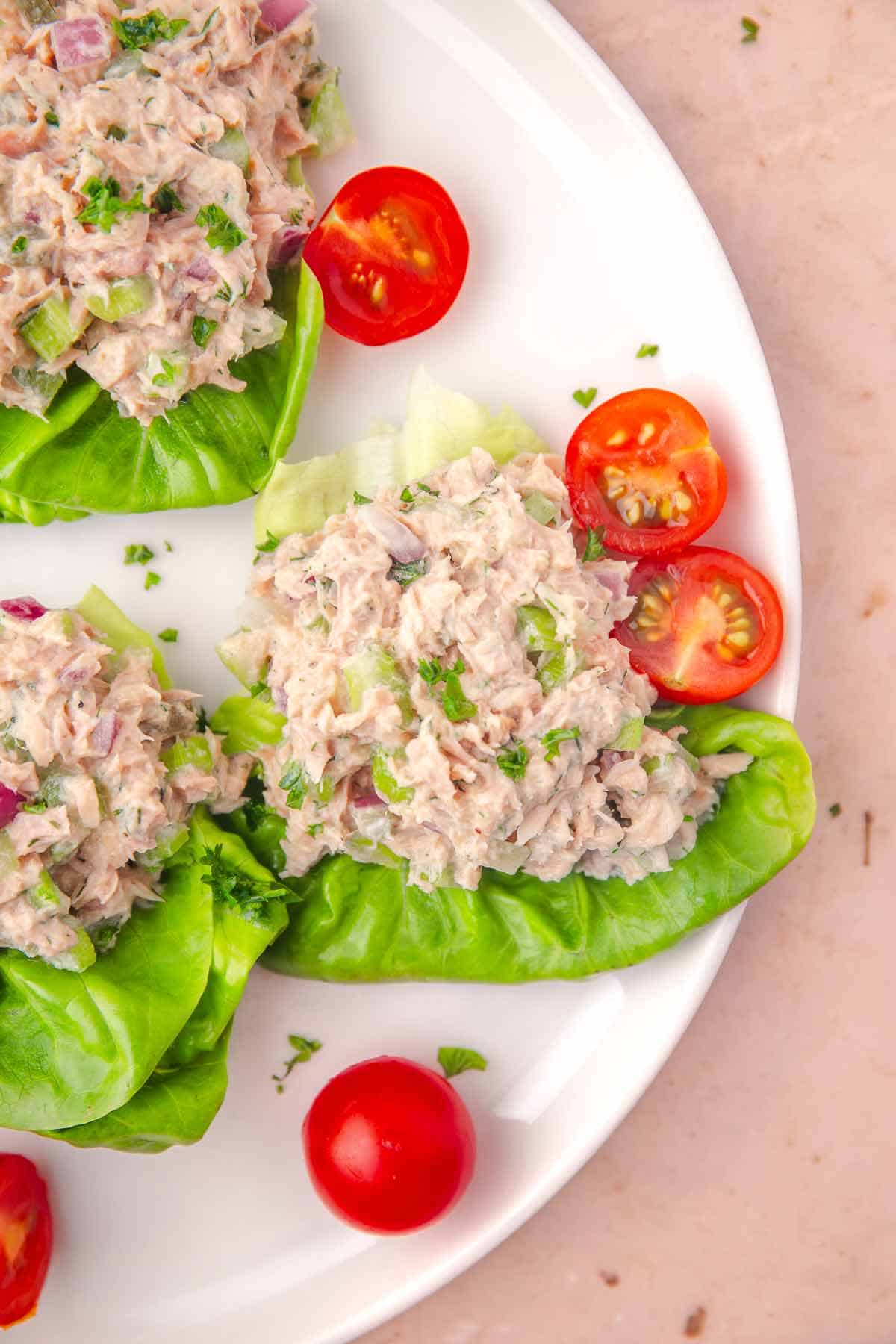 - Spoon about ¼ cup tuna salad into each lettuce leaf.2-3 mini Romaine lettuce hearts